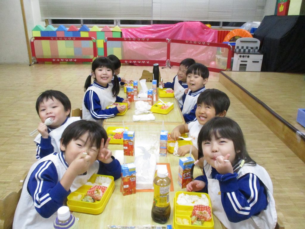 先日の預かり保育6時以降の様子です。6時になるとみんなで夕食を食べます。異年齢で交わって楽しく食べています。時には特別なおもちゃも出てきます!毎日みんな楽しそうです♪