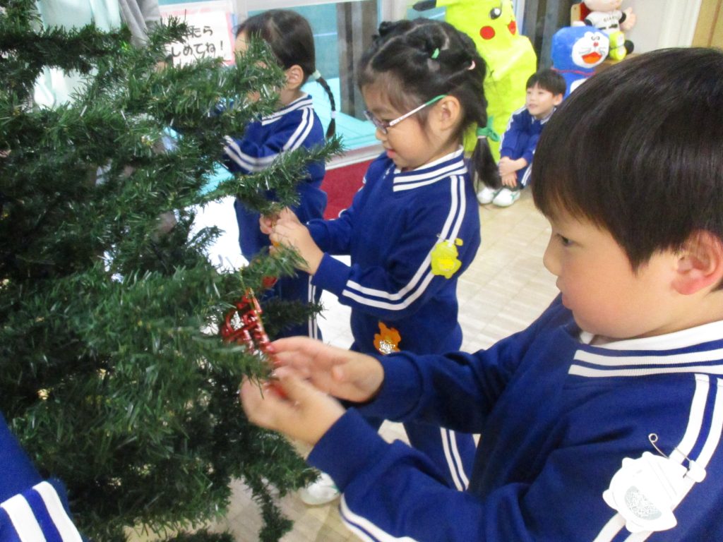 預かり保育のカリキュラムで、ツリー点灯式を行いました。 幼稚園の大きなクリスマスツリーに、たくさんの飾りをつけました。 そして、カウントダウンをして点灯!電気を消した幼稚園の中、キラキラ輝くクリスマスツリーに大きな歓声が...