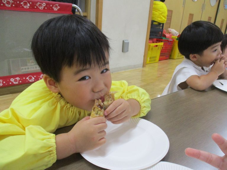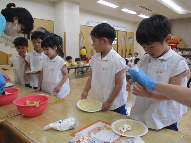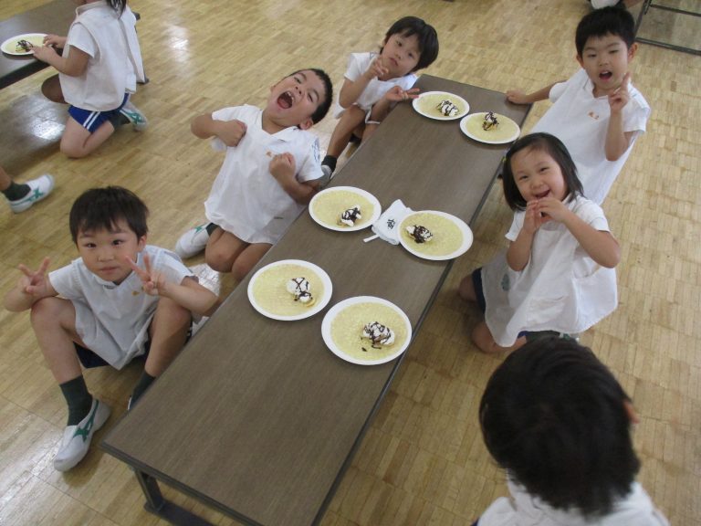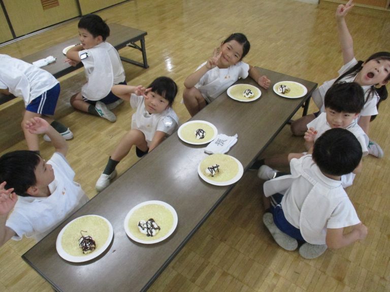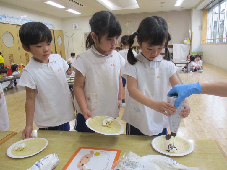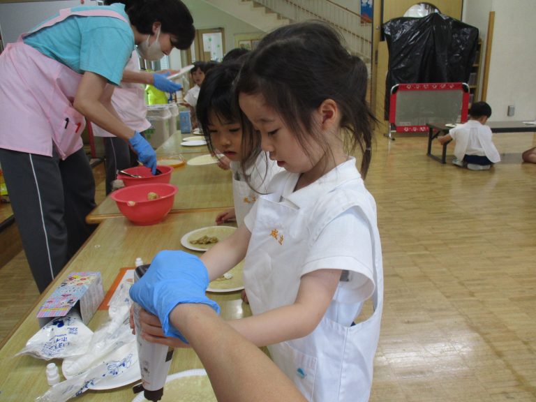 先週の金曜日に預かり保育でお菓子作りを行いました。たくさんの子どもたちが参加してクレープ作りを行いました。自分たちで生クリームやチョコソースをしぼりました。最後は自分で巻いてぱくっ!!とても美味しくてお代わりしたい!とみんな言っていました。