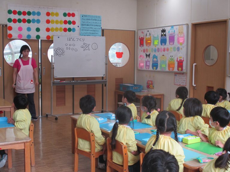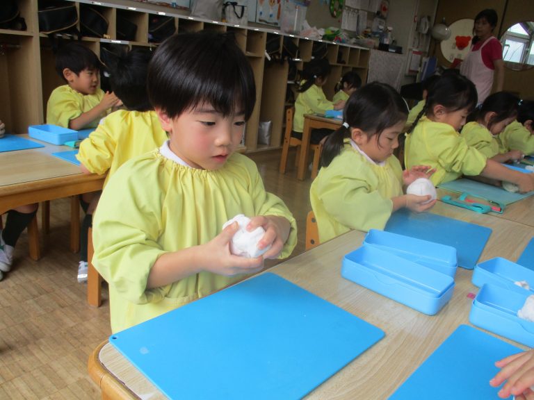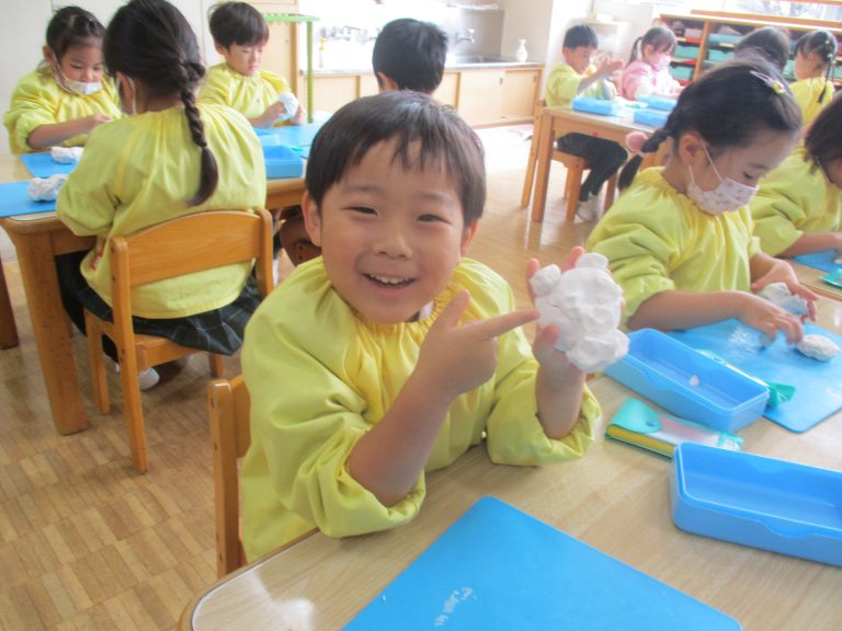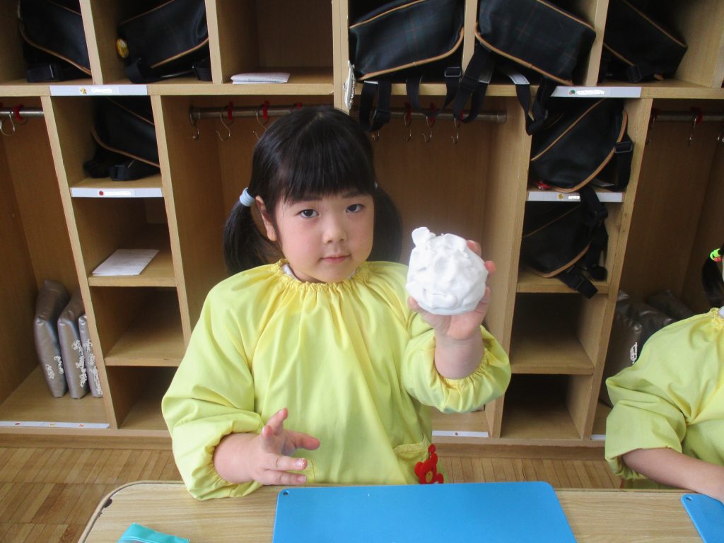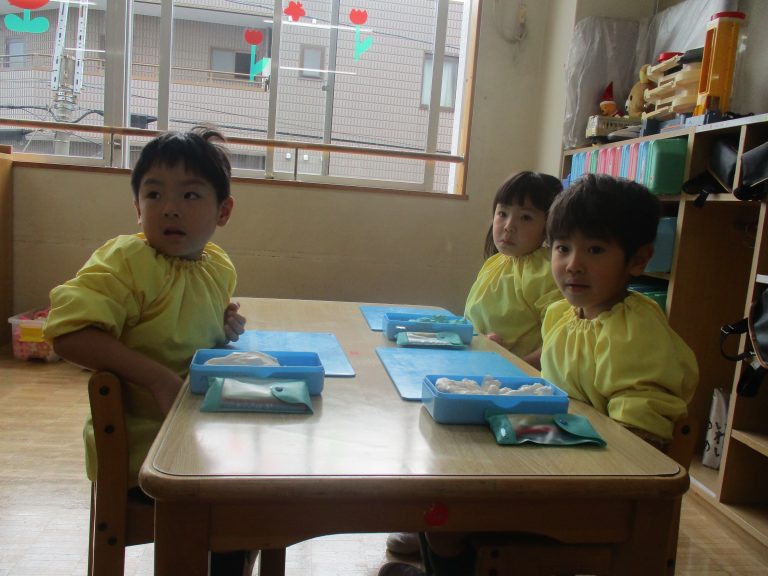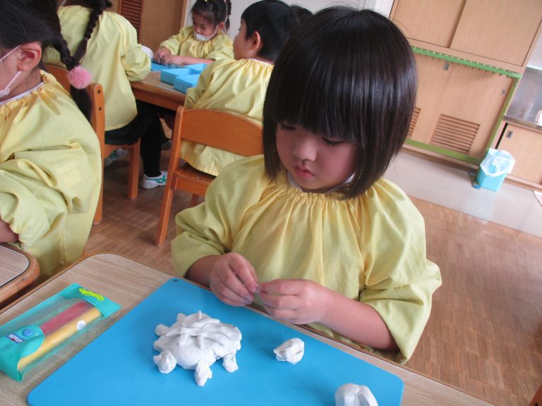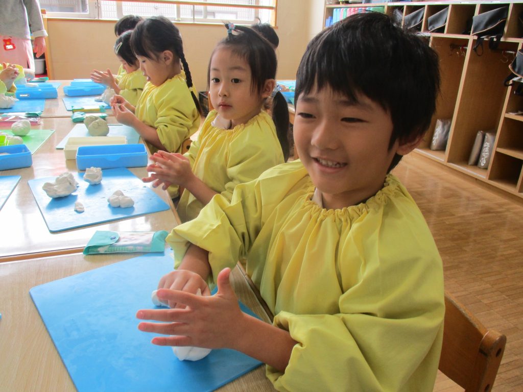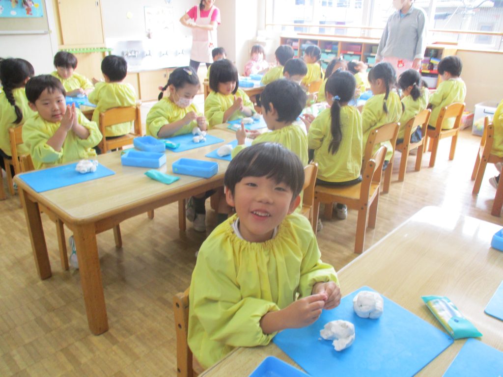 そこではパン作りをする予定なので、年中組では本日パン作りの練習を粘土で行いました。