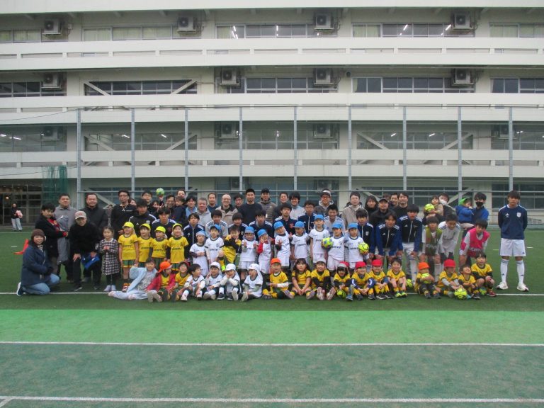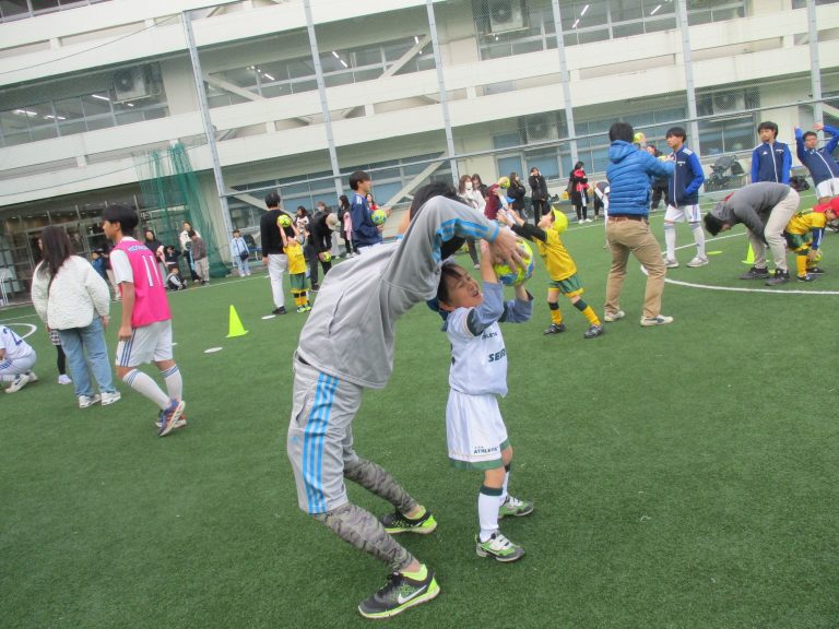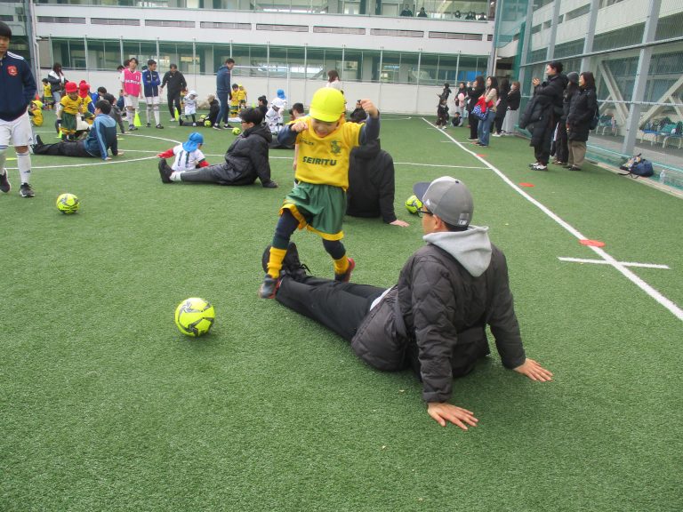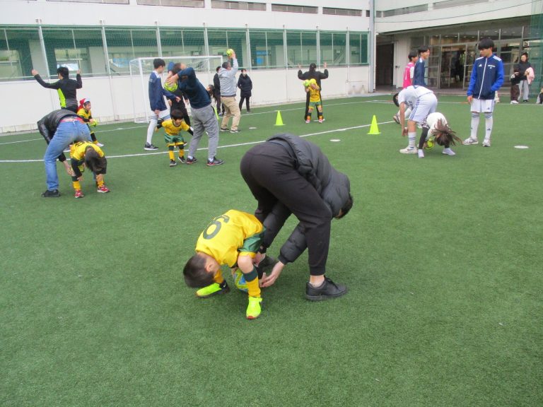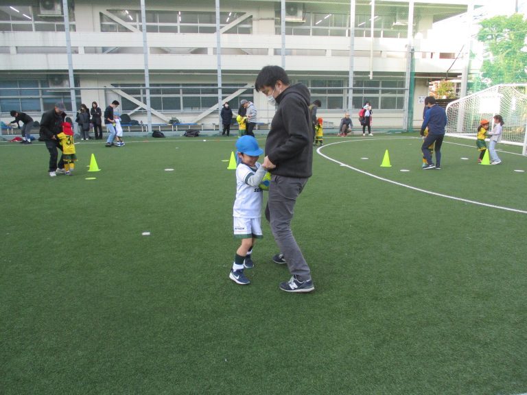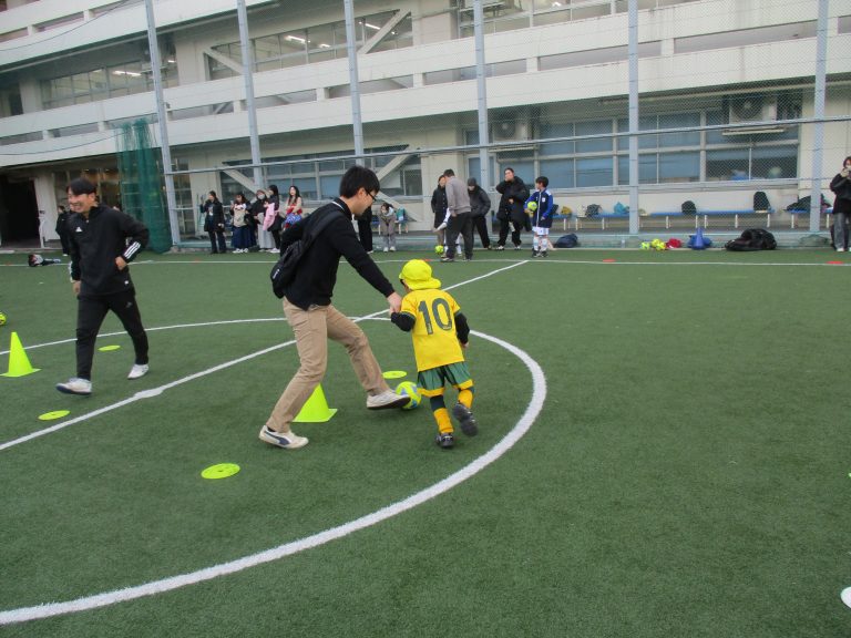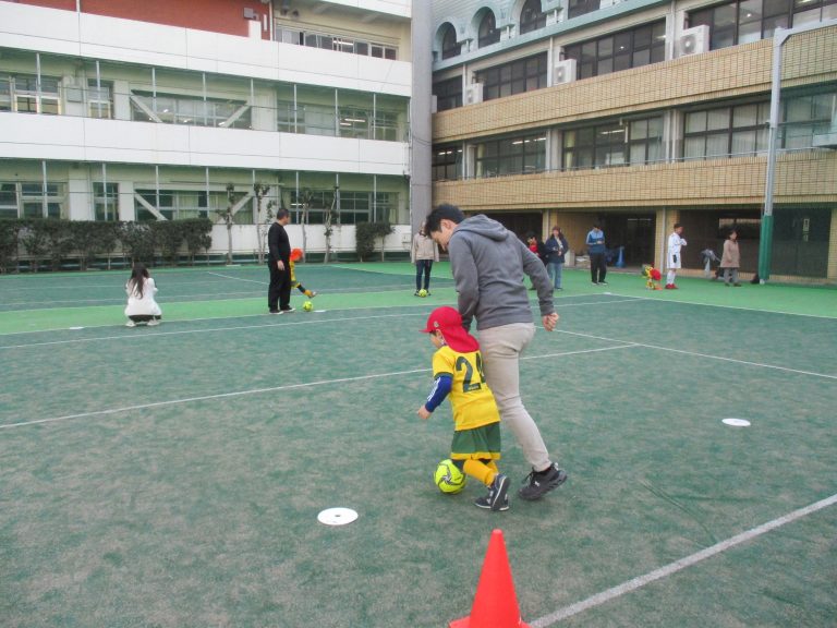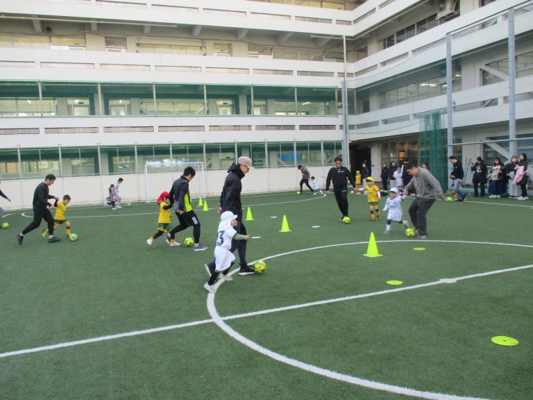 成立学園中学高等学校の校庭にてサッカー教室に入会している子どもたちと保護者の方も一緒に「親子サッカー」を行いました!