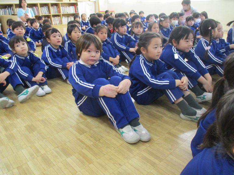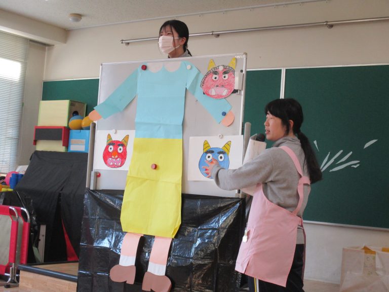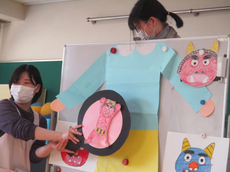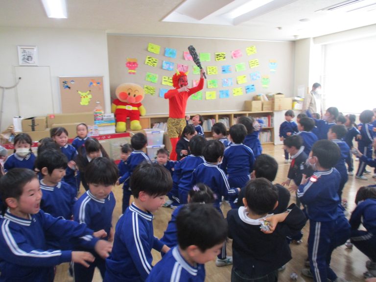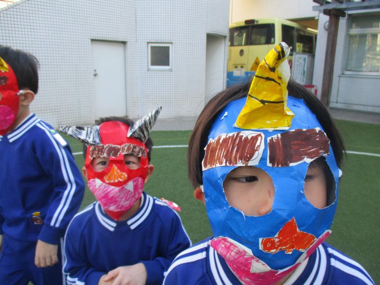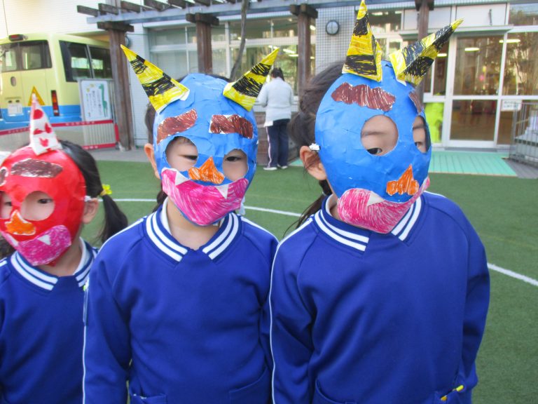 本日豆まき集会を行いました。豆まきの由来や鬼が心の中にいないかな?などのお話を聞いた後…赤鬼がやってきました!!みんな紙で作った豆を鬼に向かって投げ心の中の弱い鬼を退治しました。その後は学年ごとに園庭で豆まきをして楽しみました。1年健やかに過ごしてくださいね。
