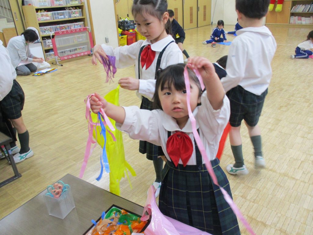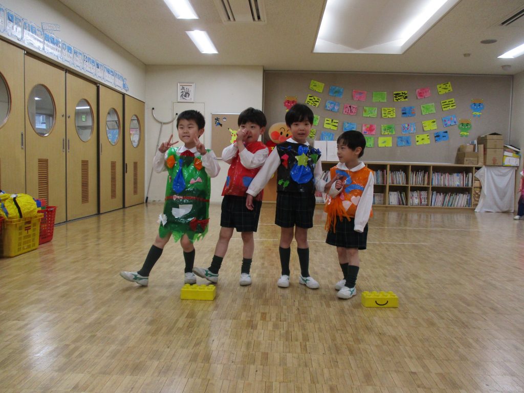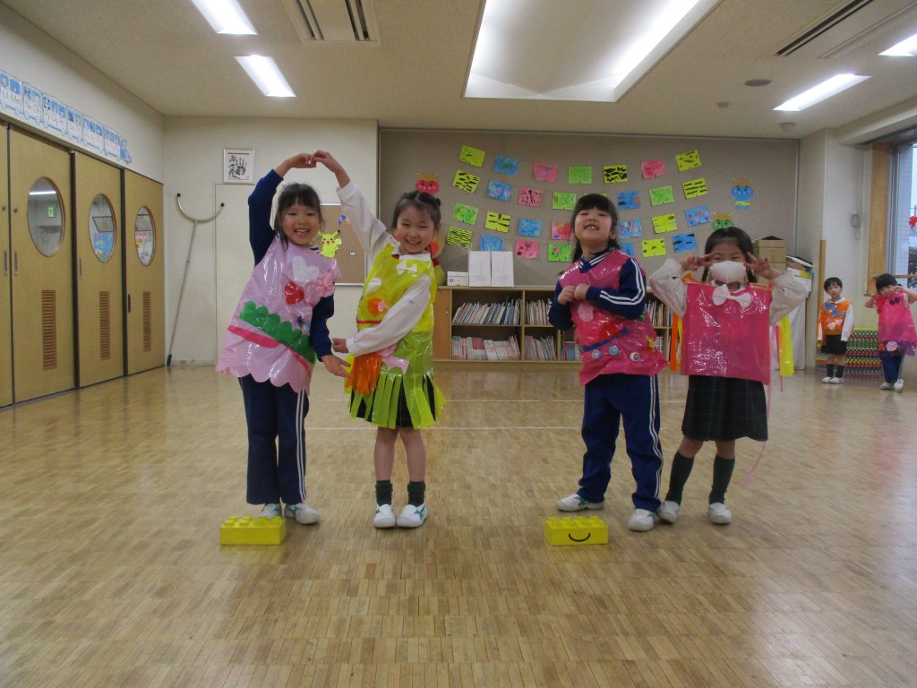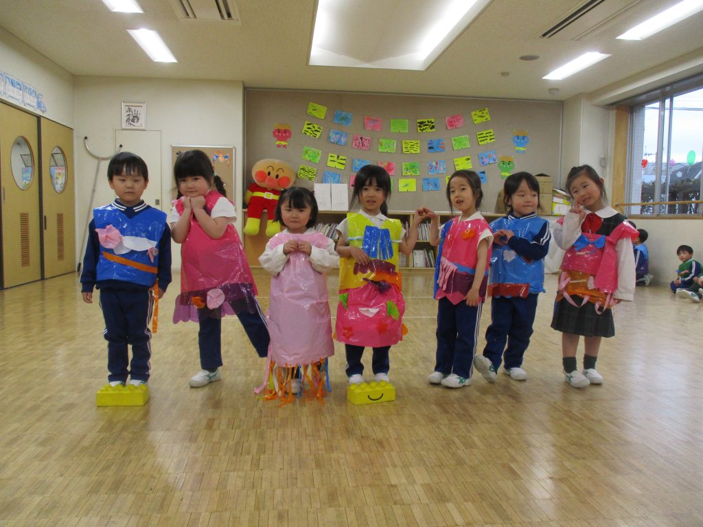 先日4時からの預かり保育カリキュラムでファッションショーを行いました。自分で生地を選び思い思いの装飾を施しました。最後はみんなの前で披露しました。