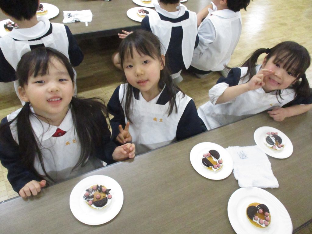 預かり保育のカリキュラムでお菓子作りを行いました! パンケーキにホイップクリーム、アポロチョコレート、オレオクッキーを飾り付けしました♪ 顔にクリームをつけながら「おいしい!」と言って食べている姿が可愛かったです☆ &n...
